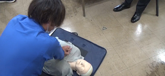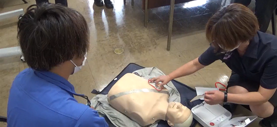意識・呼吸確認、胸骨圧迫、救急車手配、AED手配、AED装着・ショックなど役割分担や手順の確認を学び、一刻を争う場面でも冷静に対応できるように訓練を行いました。